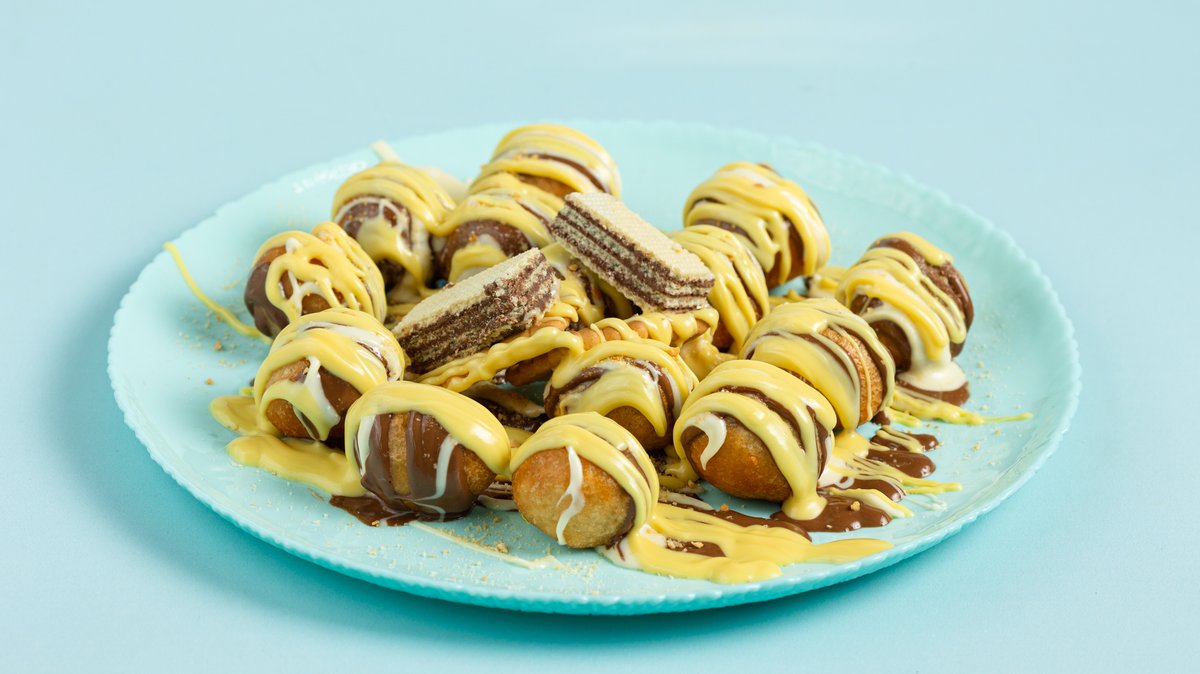 Λουκουμάδες Cheesecake με Μπισκότο Cookies και Πραλίνα Μπανάνα