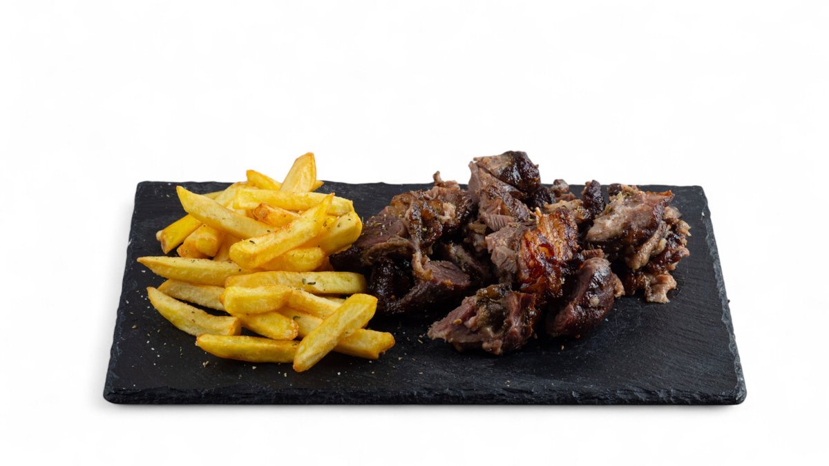 Συνοδεύεται από ντομάτα, κρεμμύδι και πατάτες τηγανητές