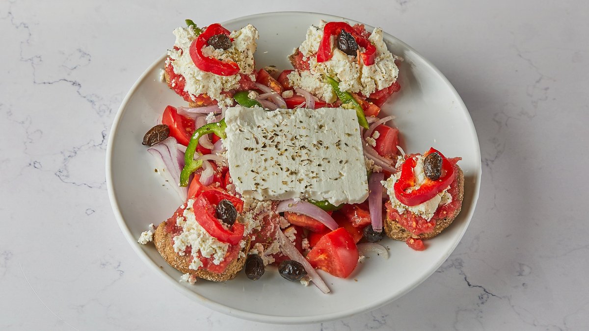 Σαλάτα με κρίθινο παξιμάδι, μυζήθρα, ντομάτα, αγγούρι, πιπεριά και κρεμμύδι