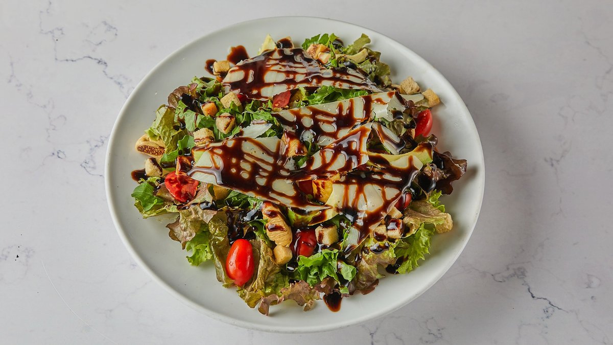 Σαλάτα με γραβιέρα, λόλα, ρόκα, ντοματίνια, avocado, αποξηραμένα σύκα, κρουτόν και dressing βαλσάμικο