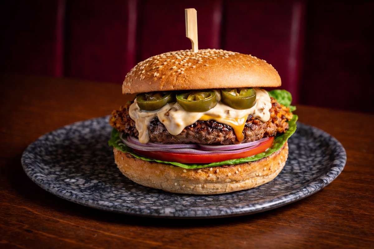 Με μπιφτέκι 100% μοσχαρίσιο, τυρί cheddar, καραμελωμένα κρεμμύδια, καπνιστή μαγιονέζα, ντομάτα και μαρούλι