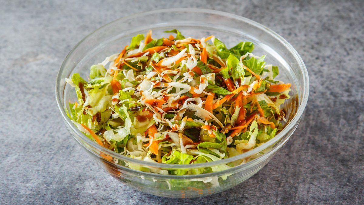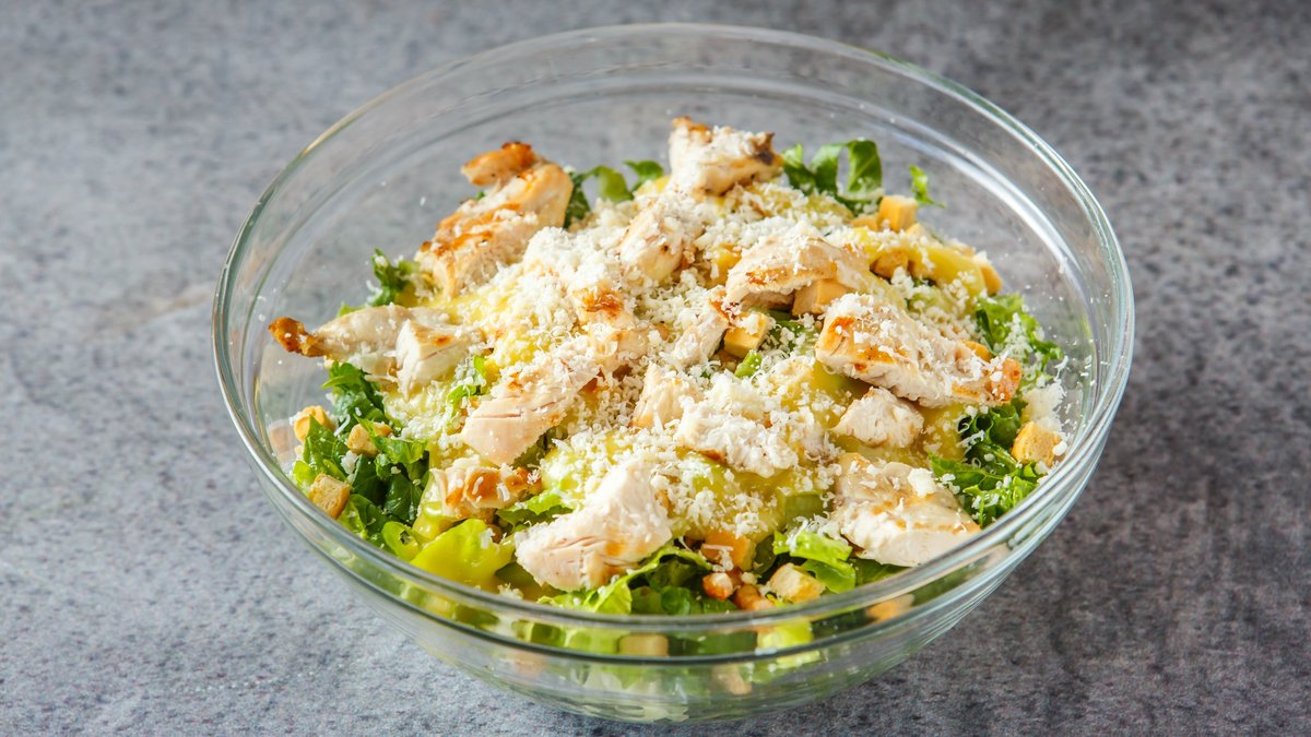 Λόλα, ρόκα, μαρούλι, κρουτόν, κοτόπουλο, καλαμπόκι, φλούδες παρμεζάνας και σως Καίσαρα