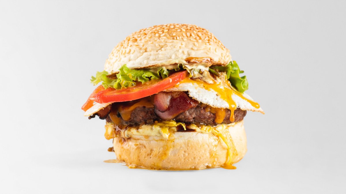 Αφράτο ψωμάκι με ζουμερό μοσχαρίσιο μπιφτέκι, μαρούλι, ντομάτα, μαγιονέζα, μπέικον, ένταμ και cheddar