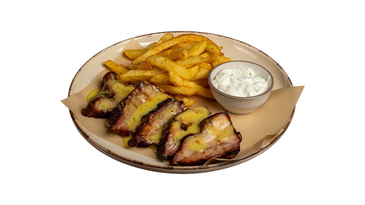 Συνοδεύεται από πατάτες, πίτα κομμένη, ντομάτα, κρεμμύδι, σως και τζατζίκι