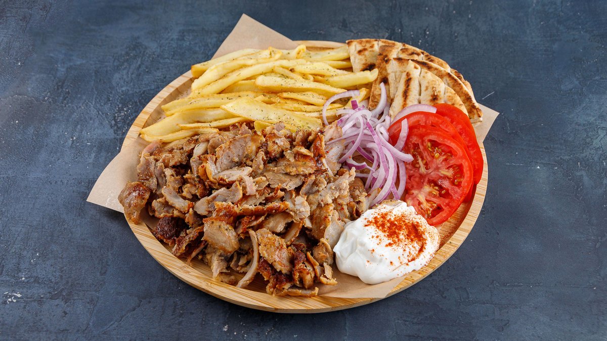 Συνοδεύεται από ντομάτα, κρεμμύδι, 1 πίτα και σως της επιλογής σου