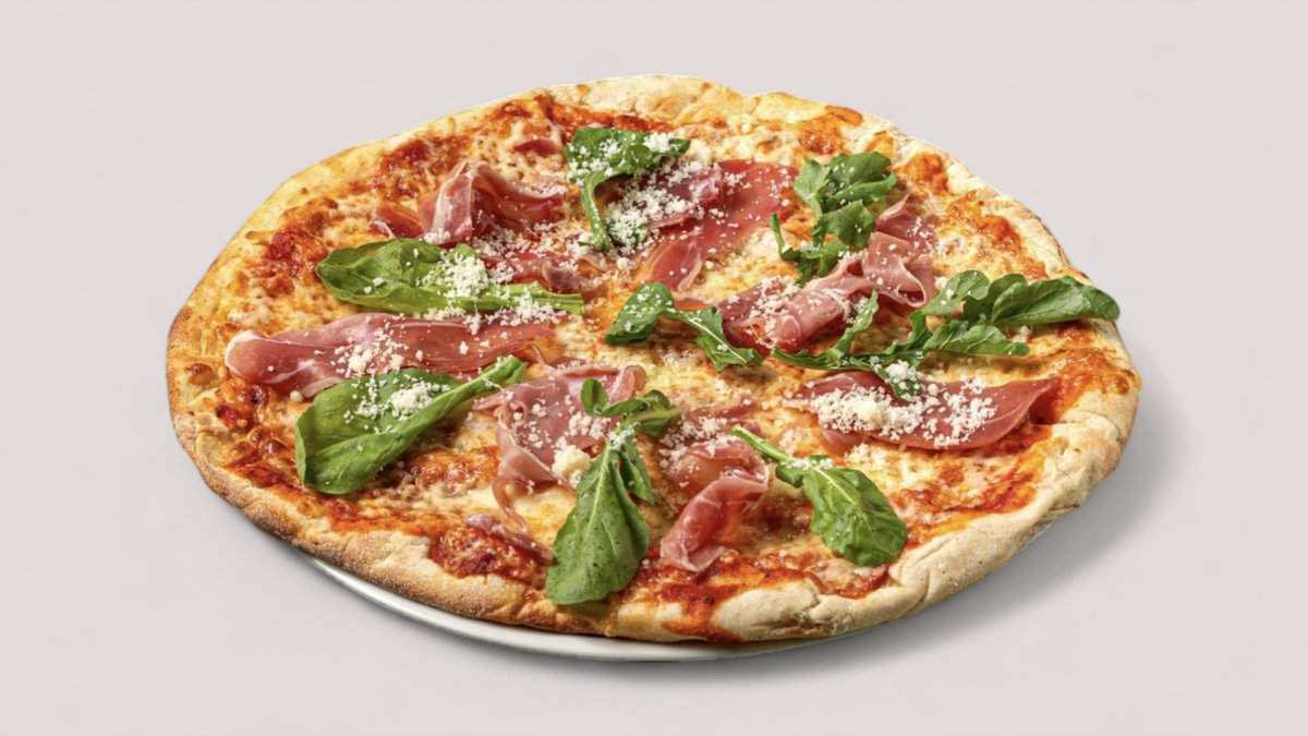 Με σάλτσα ντομάτας, μοτσαρέλα, προσούτο, παρμεζάνα, ρόκα