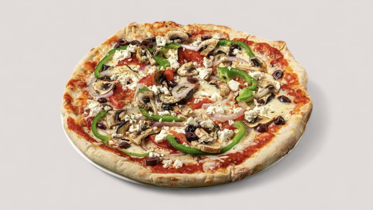 Με σάλτσα ντομάτας, μοτσαρέλα, ντομάτα, φέτα, πράσινη πιπεριά, κρεμμύδια, ελιές, ρίγανη