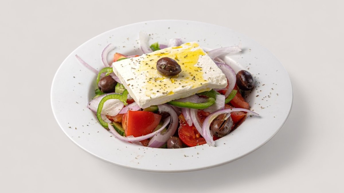 Με ντομάτα, αγγούρι, φέτα, κρεμμύδι, πιπεριά, βραστή πατάτα, ελιές, παξιμαδάκια και ελαιόλαδο