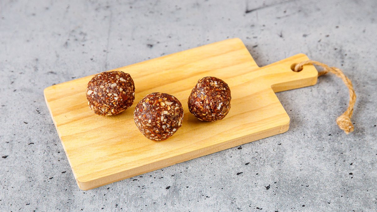 95 kcal, με 2.5 g πρωτεΐνης. Vegan μπάλα ενέργειας με βρώμη, χουρμάδες και κακάο