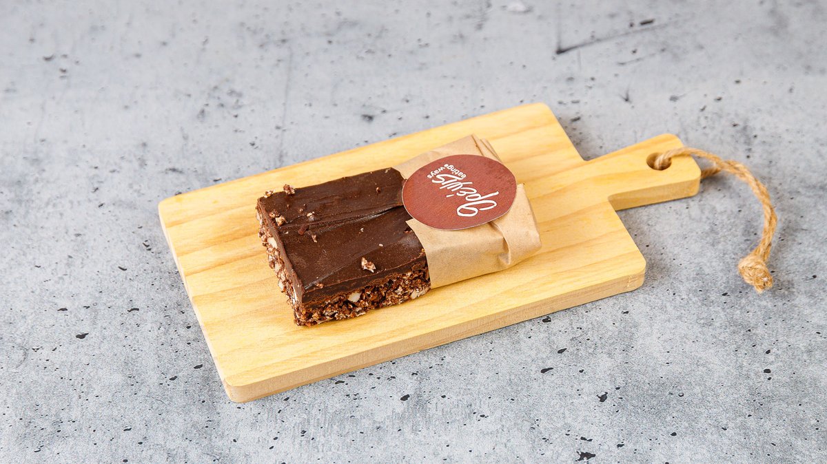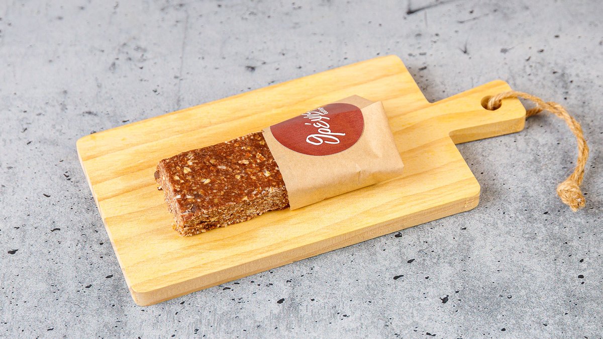 180 kcal, με 10 g πρωτεΐνης. Χειροποίητη ωμοφαγική μπάρα περίπου 80 g, με βρώμη, φυστικοβούτυρο, μέλι και πρωτεΐνη σοκολάτα