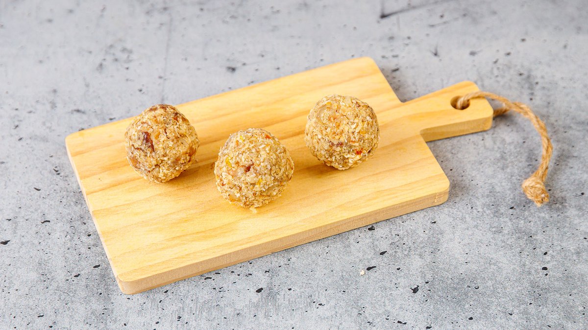 110 kcal, με 3 g πρωτεΐνης. Vegan μπάλα ενέργειας με καρύδια, καρύδα, βρώμη, καρότο, μέλι, μοσχοκάρυδο και κανέλα