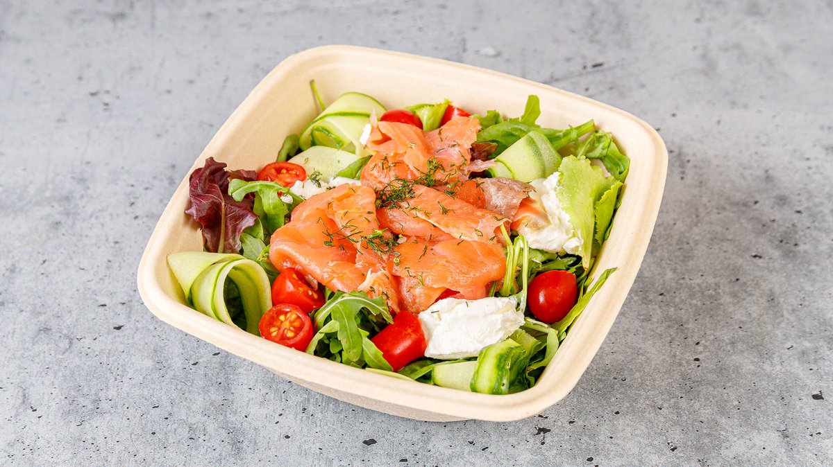 400 kcal, με 28 g πρωτεΐνης. Πράσινη σαλάτα με καπνιστό σολομό, αγγούρι και τυρί κρέμα