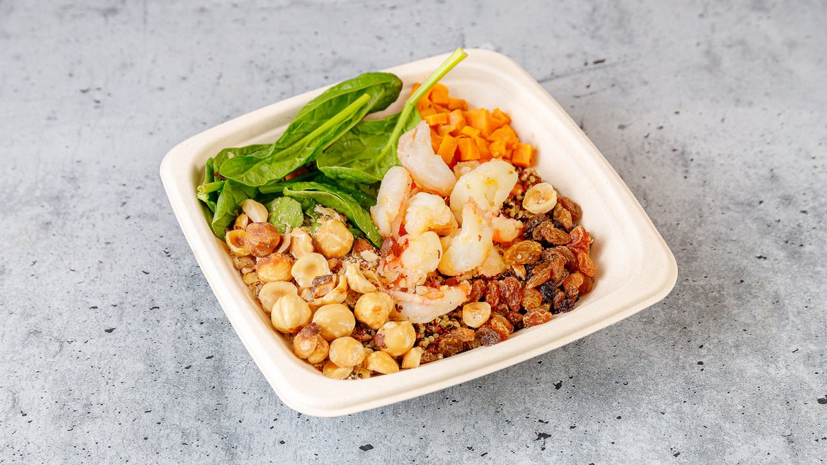 410 kcal, με 35 g πρωτεΐνης. Σαλάτα με τρίχρωμη κινόα, σταφίδες, γλυκοπατάτα, ψητές γαρίδες, baby σπανάκι, φουντούκι και dressing εσπεριδοειδών