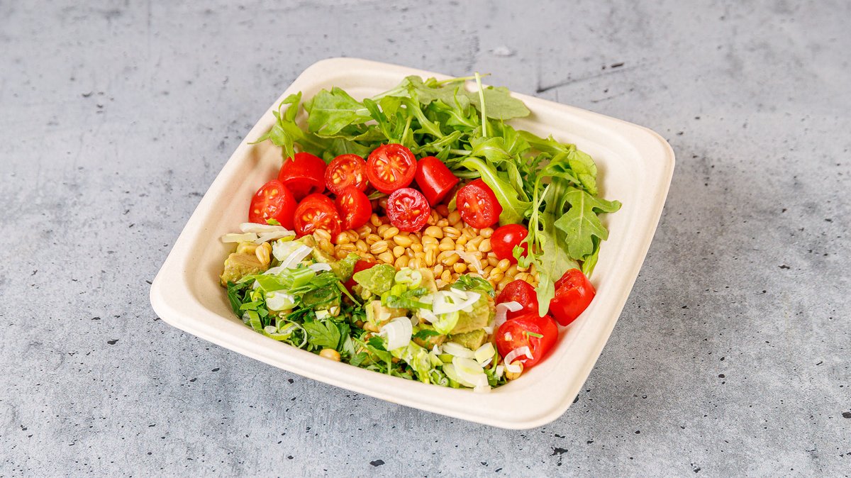 250 kcal, με 8 g πρωτεΐνης. LF vegetarian σαλάτα με σιτάρι, baby ρόκα, ντοματίνια, avocado και μυρωδικά