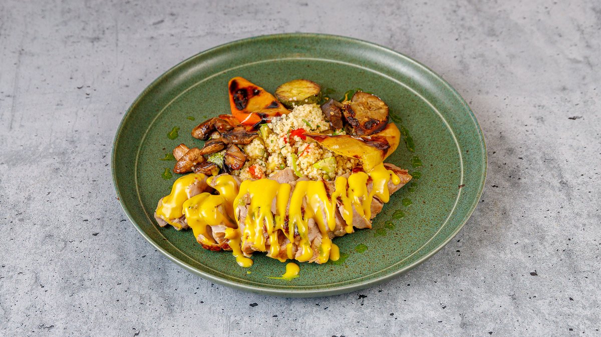 420 kcal, με 38 g πρωτεΐνης. Πιάτο με κους κους και λαχανικά εποχής
