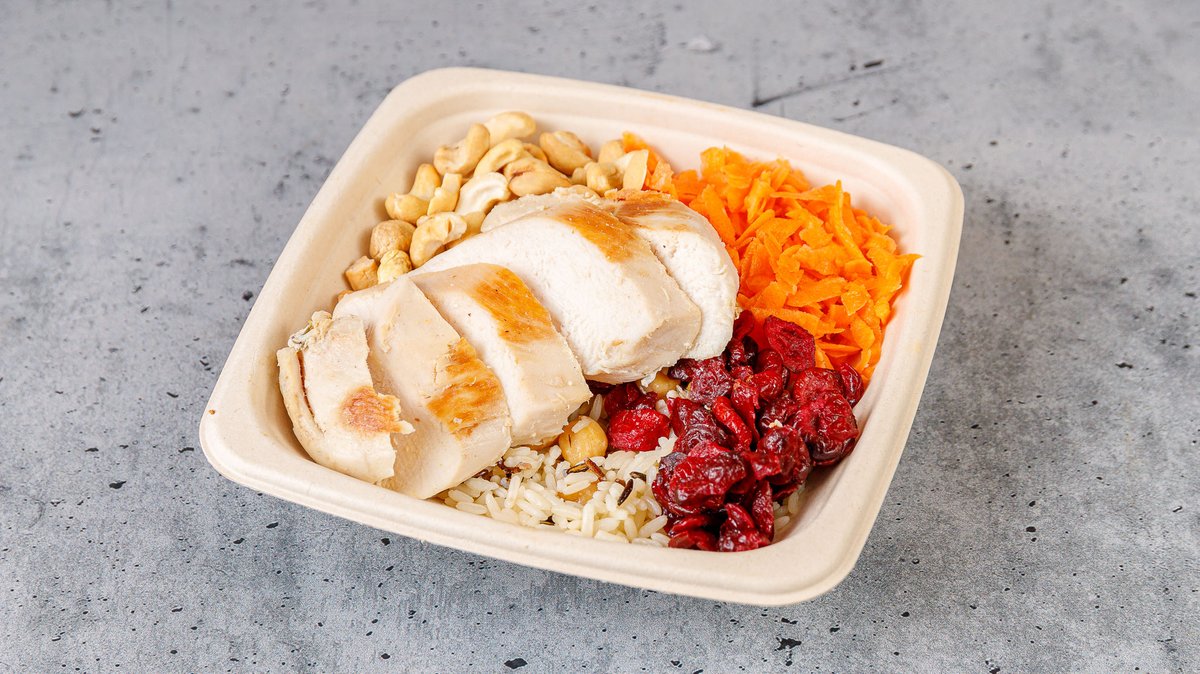 550 kcal, με 48 g πρωτεΐνης. LF gluten free σαλάτα με κοτόπουλο, άγριο ρύζι, τριμμένο καρότο, ρεβύθια, cranberries, κάσιους και dressing μηλόξυδου