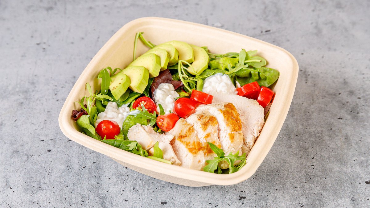 350 kcal, με 30 g πρωτεΐνης. Πράσινη σαλάτα με κοτόπουλο, cottage, ντοματίνια και avocado
