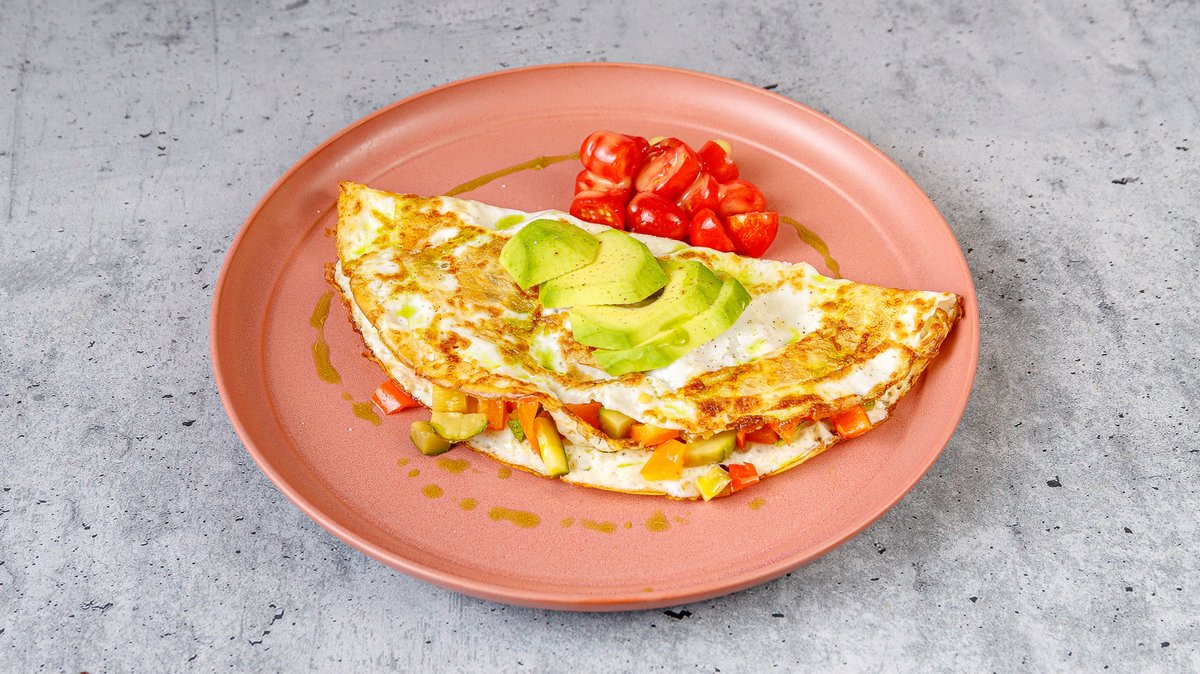 200 kcal, με 15 g πρωτεΐνης. LG vegetarian gluten free ομελέτα με 3 ασπράδια αυγού, κολοκύθι, μανιτάρια, μελιτζάνα, πράσινη πιπεριά, κρεμμύδι, avocado και ντοματίνια