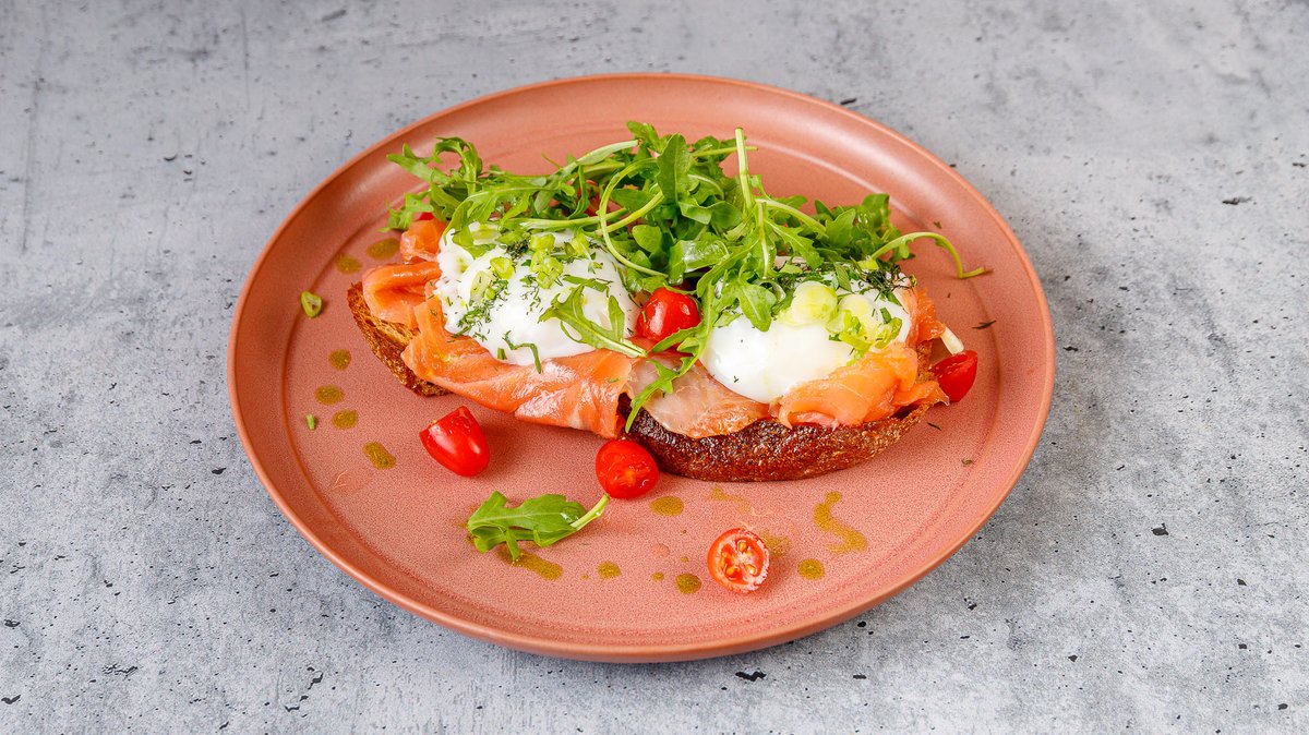 350 kcal, με 30 g πρωτεΐνης. Αυγά ποσέ με ψωμί ολικής άλεσης, καπνιστό σολομό και φρέσκα μυρωδικά