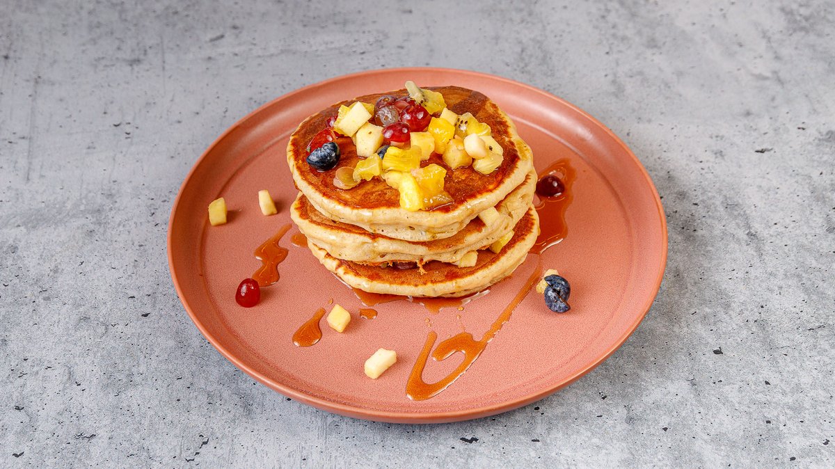 320 kcal, με 19 g πρωτεΐνης. Vegan pancakes 3 τεμαχίων με φρούτα εποχής και σιρόπι σφενδάμου