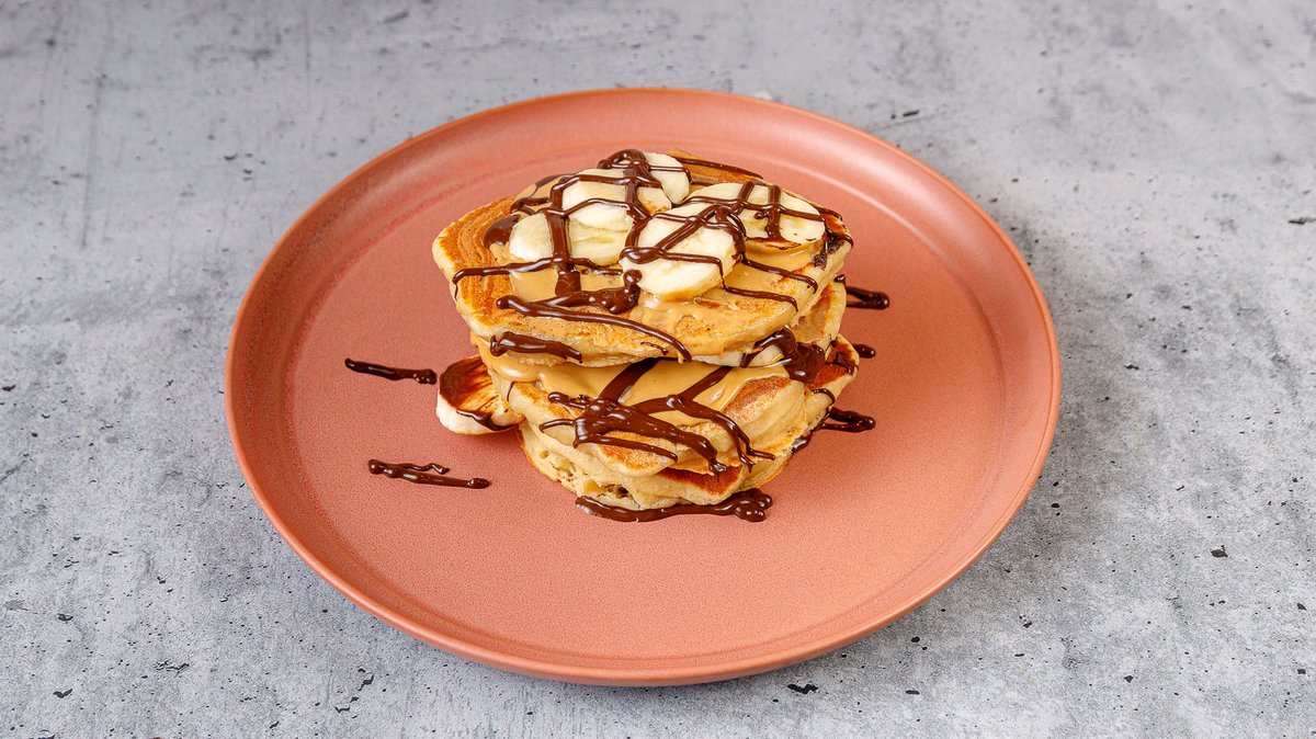 360 kcal, με 22 g πρωτεΐνης. Vegan pancakes 3 τεμαχίων με φυστικοβούτυρο και μαύρη σοκολάτα