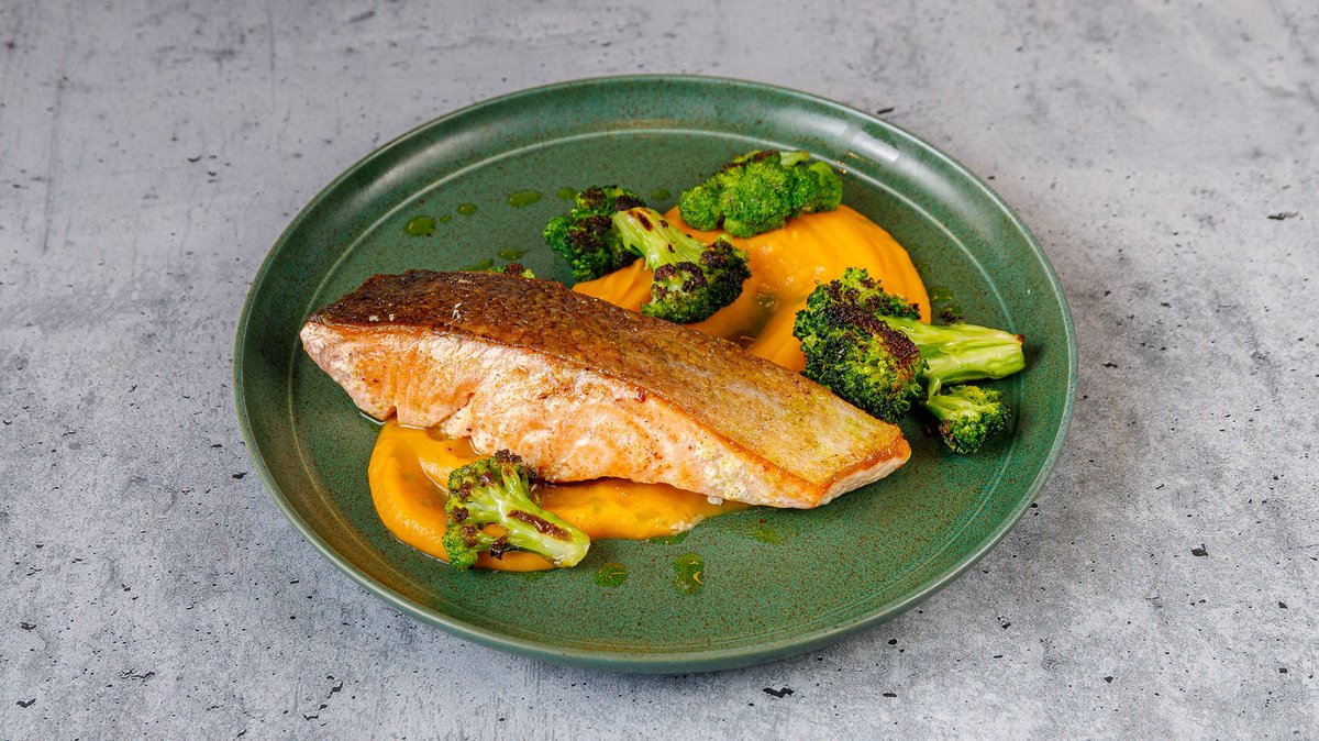 500 kcal, με 36 g πρωτεΐνης. LF gluten free vegetarian πιάτο με πουρέ γλυκοπατάτας, μπρόκολο και πράσινο λάδι