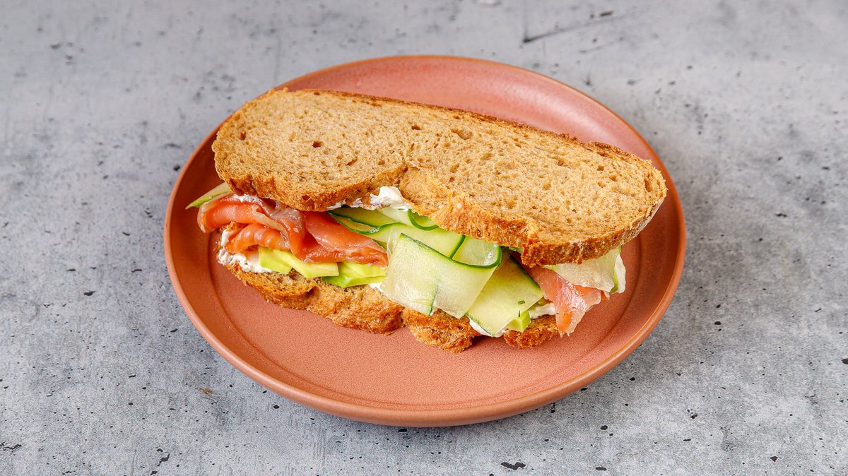 330 kcal, με 17 g πρωτεΐνης. Σαλάτα με σολομό, αγγούρι, avocado και τυρί κρέμα με χαμηλά λιπαρά