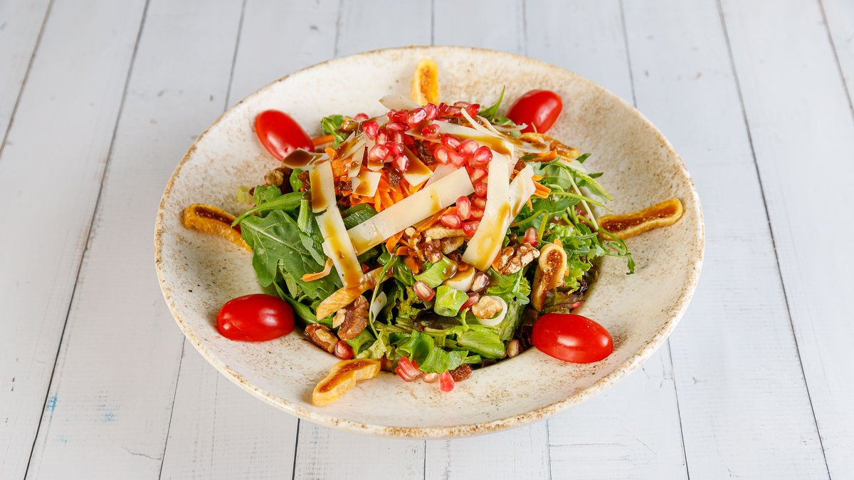 Ρόκα, λόλα, φρέσκο κρεμμύδι, καρότο, ντομάτα, αποξηραμένα σύκα, σταφίδα, καρύδια, τριμμένη γραβιέρα, βαλσάμικο