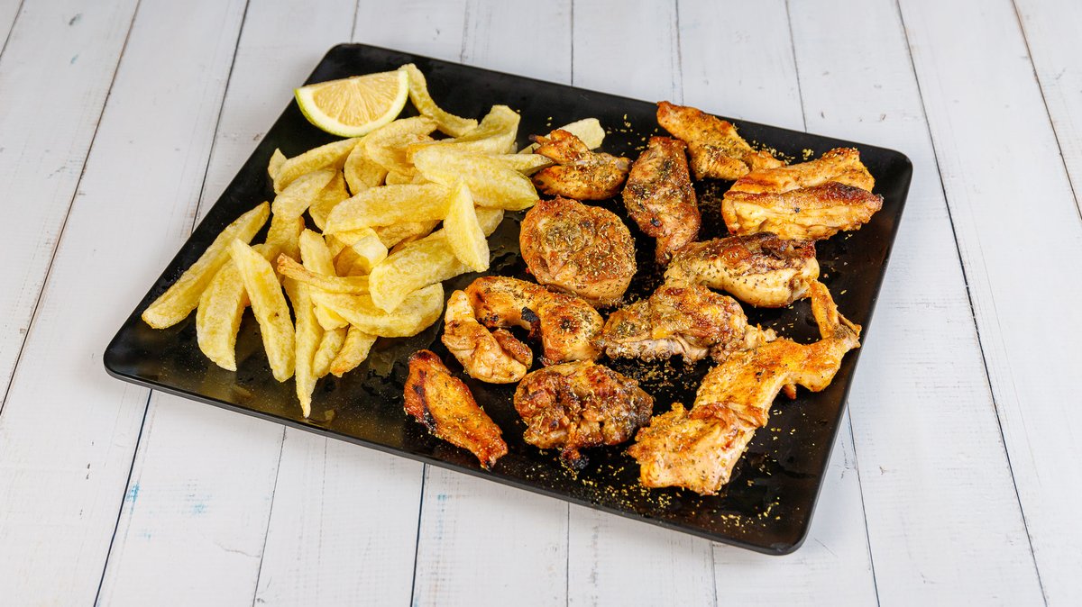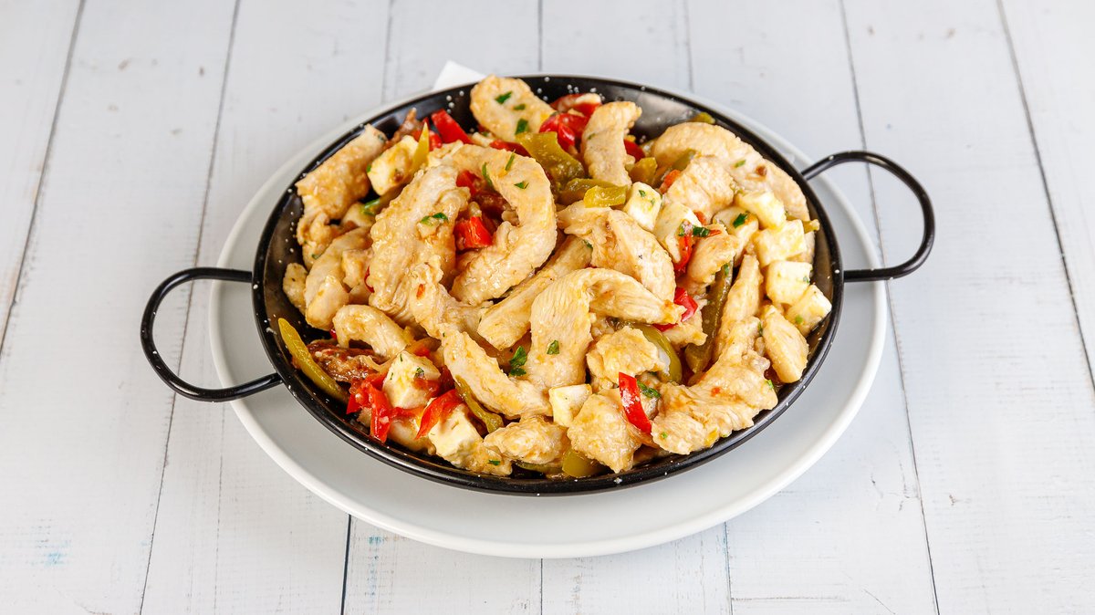 Αρνί σωταρισμένο με πιπεριές και φρέσκο κρεμμύδι, ντομάτα, φέτα Συνοδεύεται με πατάτες τηγανιτές