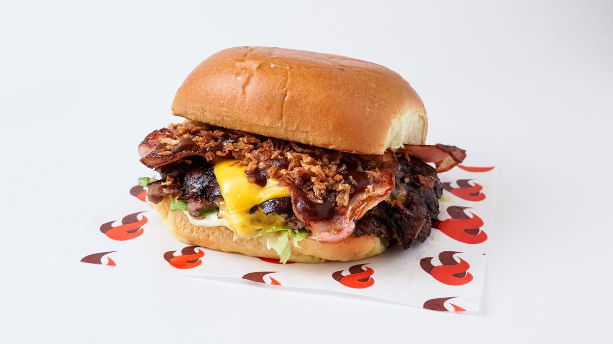 Μαλακό ψωμάκι με πουρέ πατάτας, διπλό μοσχαρίσιο μπιφτέκι με cheddar, αίσμπεργκ, μπέικον, τραγανό κρεμμύδι, bbq και Delly's sauce.