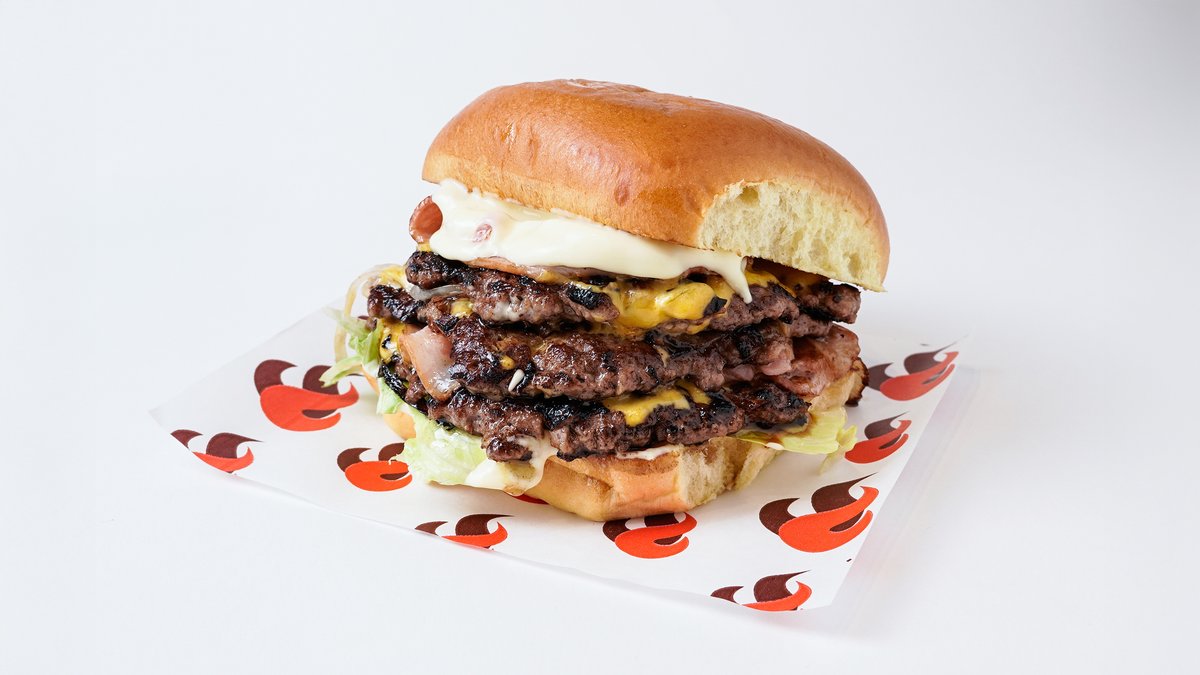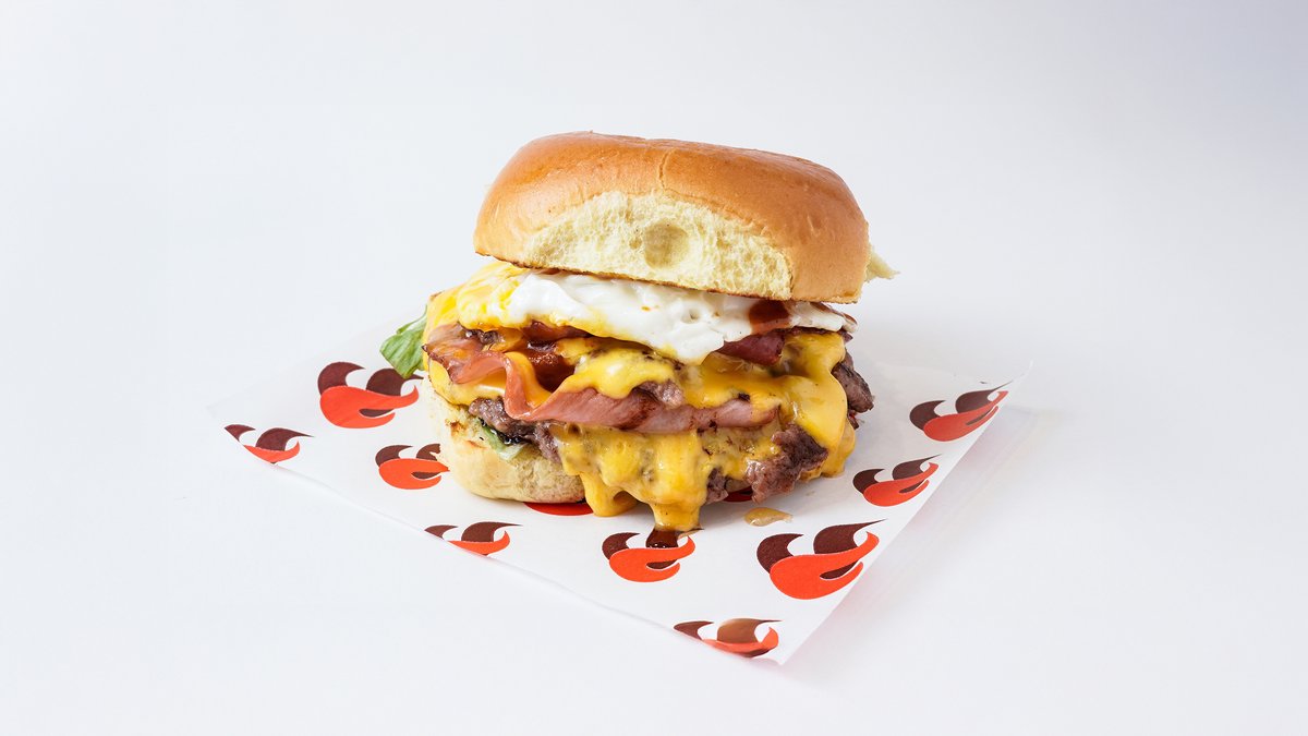 Με διπλό μπιφτέκι μοσχαρίσιο, μπέικον, cheddar, αυγό τηγανητό, μαρούλι, ντομάτα, κρεμμύδι και σως