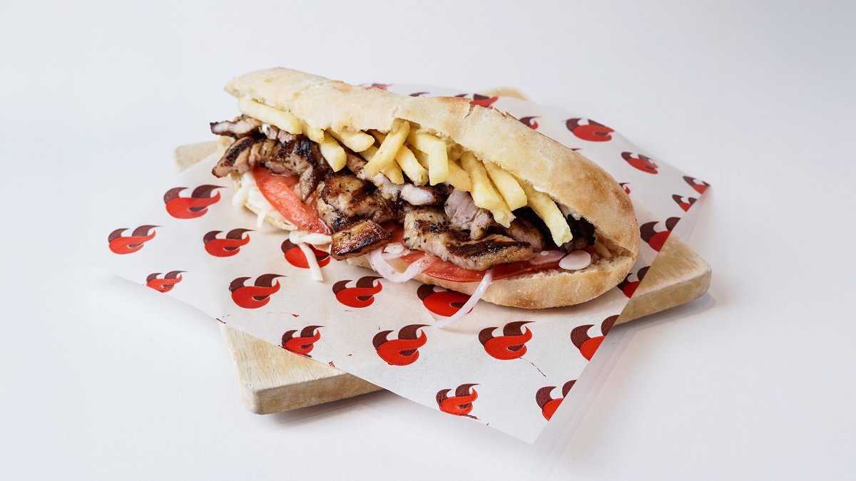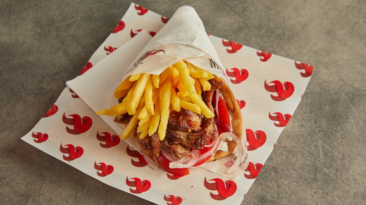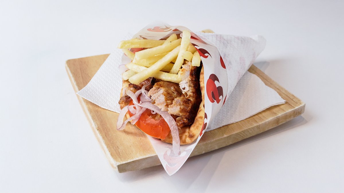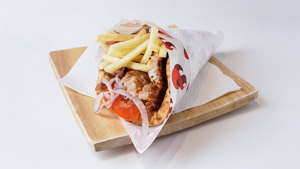 Pita club γύρος κοτόπουλο με τα υλικά της επιλογής σου. Συνοδεύεται από κλασικές ή χωριάτικες πατάτες τηγανητές