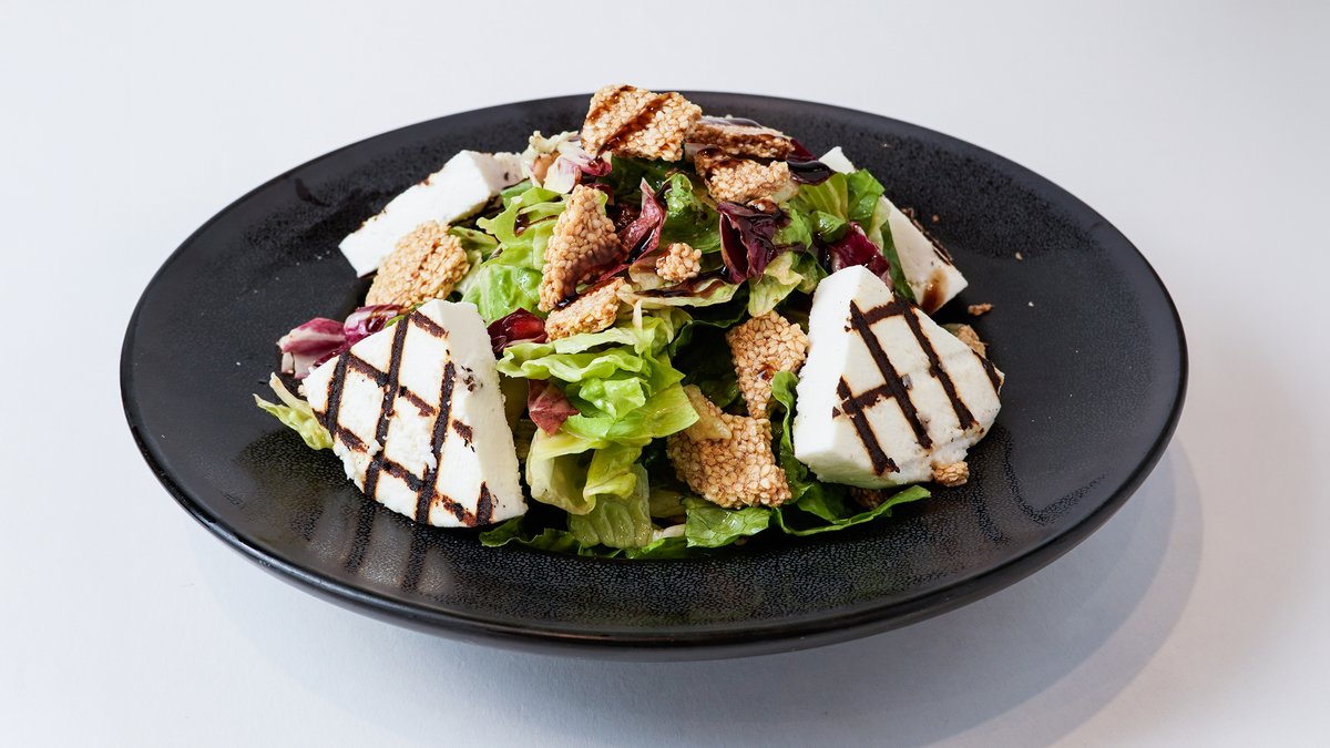 Σαλάτα με κινέζικο λάχανο, radicchio, λόλα πράσινη, λόλα κόκκινη, λιαστή ντομάτα, ντοματίνια, καρύδια, κρουτόν, μανούρι ψητό και dressing βαλσάμικο