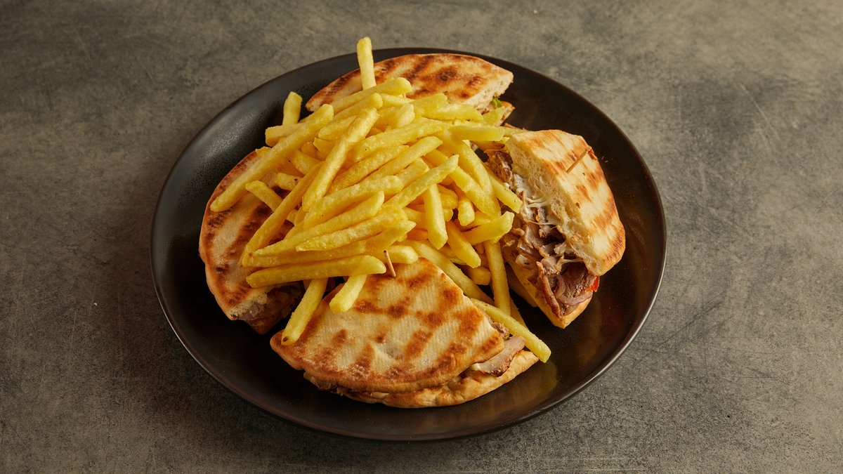 Pita club γύρος χοιρινός με τα υλικά της επιλογής σου. Συνοδεύεται από κλασικές ή χωριάτικες πατάτες τηγανητές