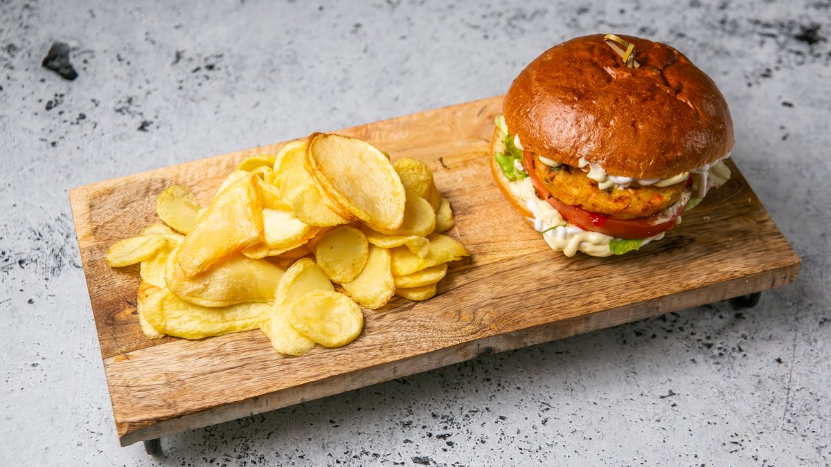 Με Vegan μπιφτέκι, φυτικό τυρί, μαρούλι, ντομάτα, καραμελωμένο κρεμμύδι, πικάντικη φυτική σως μαγιονέζας και ketchup.