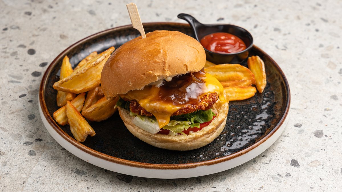 Με ψωμάκι brioche, κοτόπουλο, μαρούλι, cheddar, μαγιονέζα και καραμελωμένα κρεμμύδια. Συνοδεύεται απο πατάτες wedges και dip μαγιονέζας