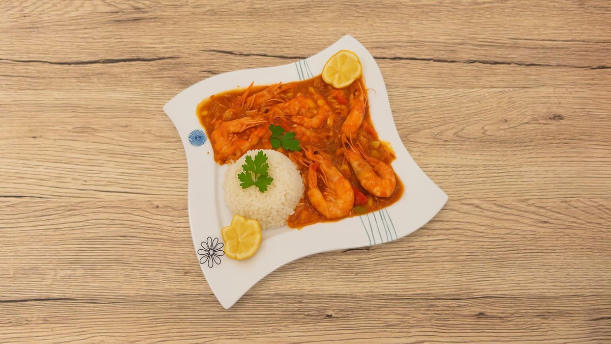 Γαρίδες μαγειρεμένες σε πλούσια σάλτσα κάρυ με καρυκεύματα και κρέμα γάλακτος. Συνοδεύεται με ρύζι μπασμάτι ή δύο πίτες.