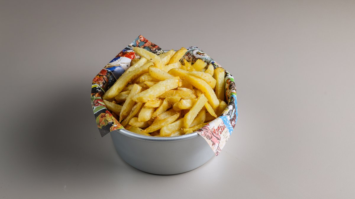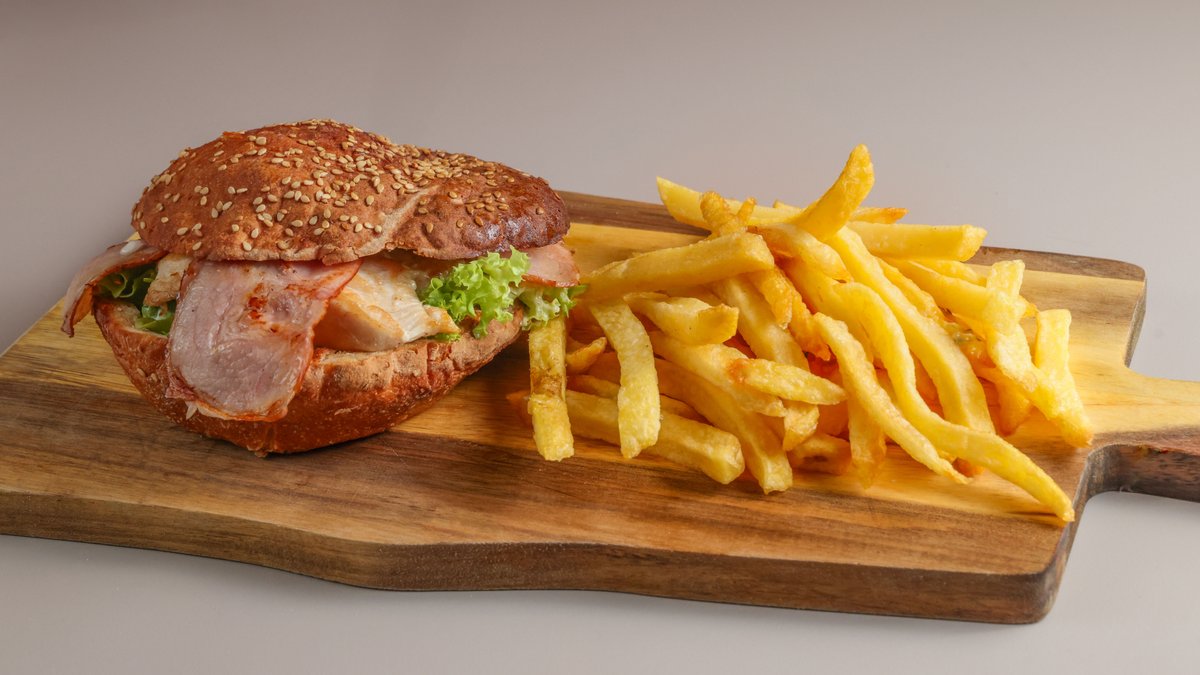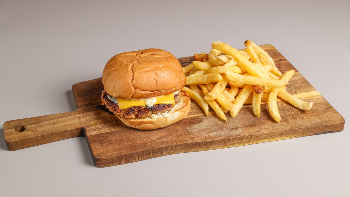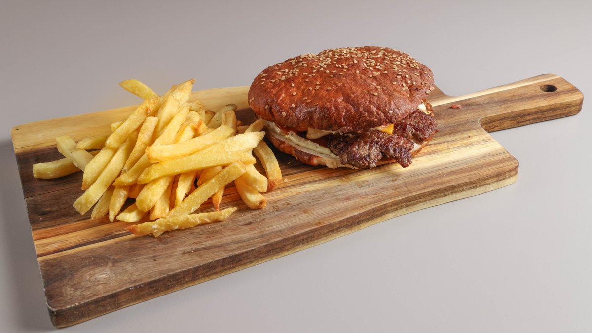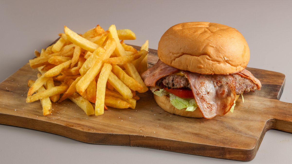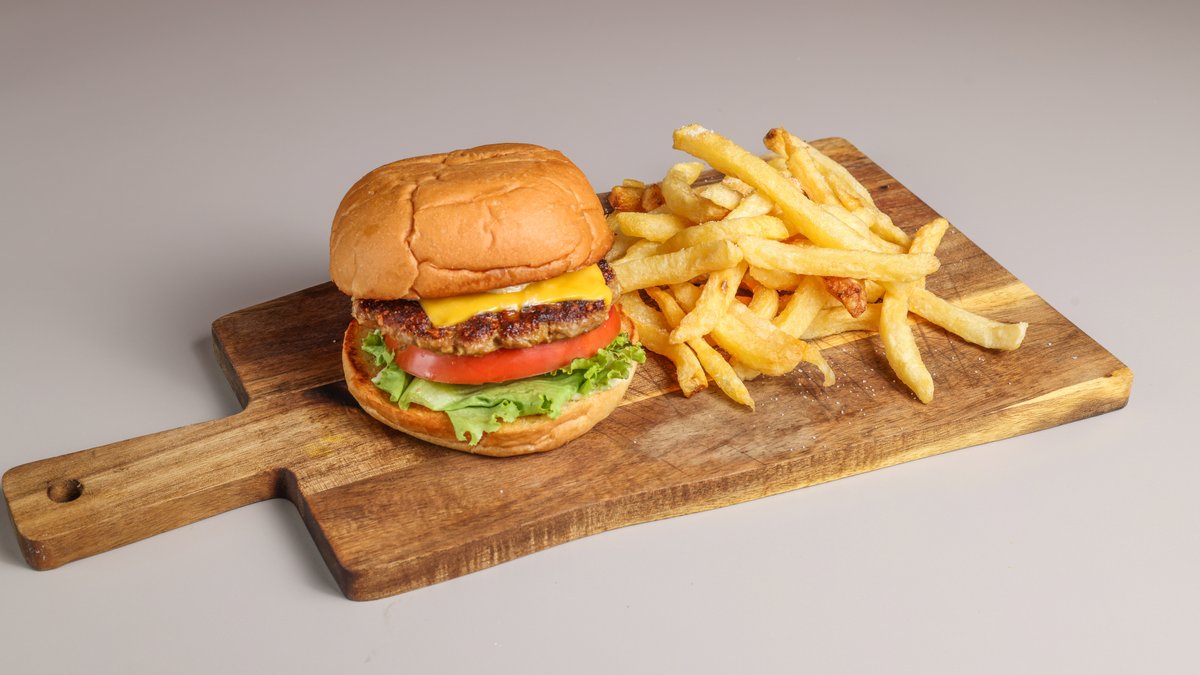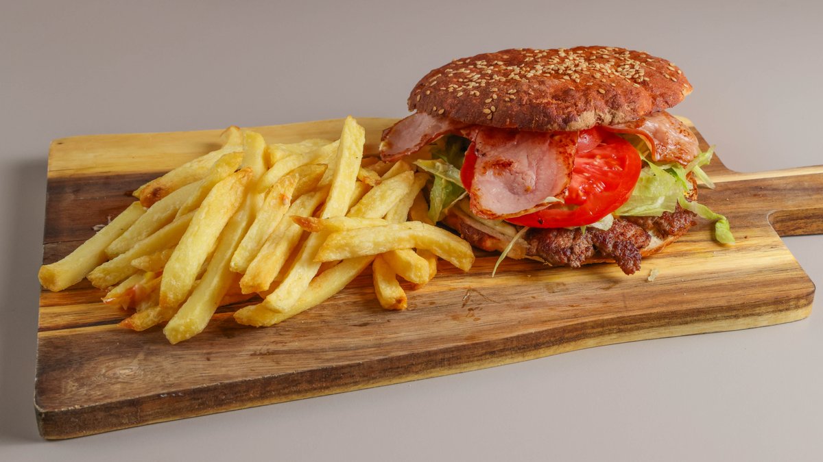 Κλασσικό burger με μοσχαρίσιο μπιφτέκι, ντομάτα, iceberg, μαγιονέζα, μπέικον και cheddar
