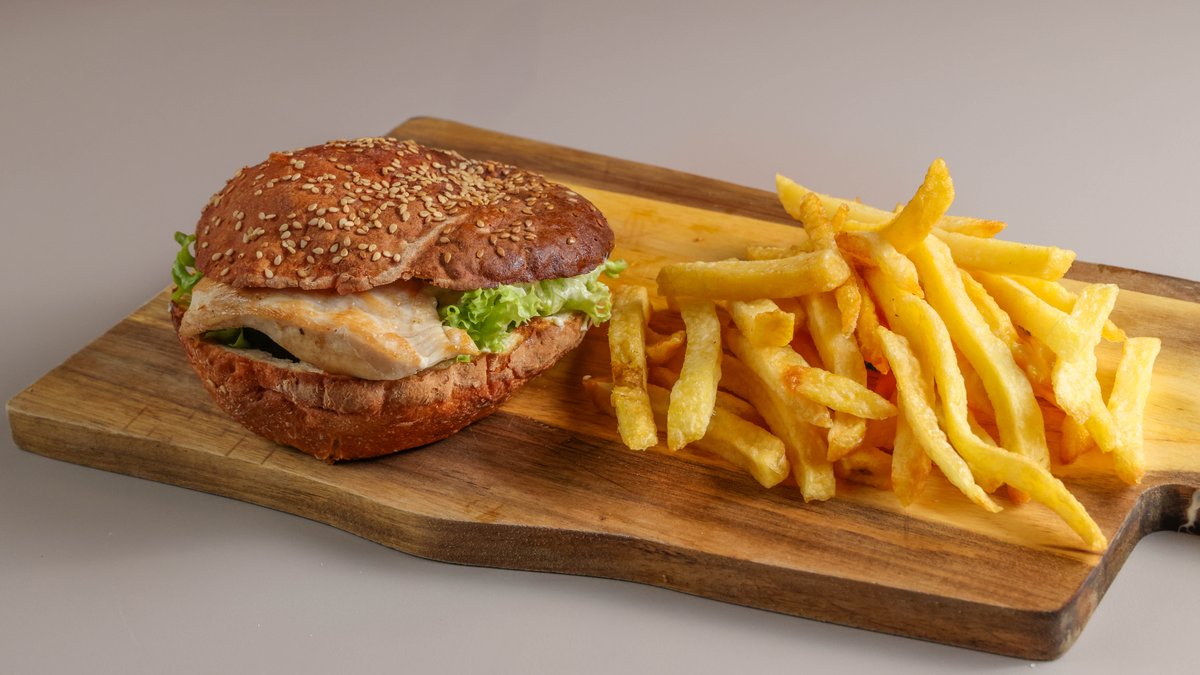 Μπέργκερ με gluten free ψωμάκι, φιλέτο κοτόπουλο, σως μουστάρδας, ντομάτα, iceberg, cheddar
