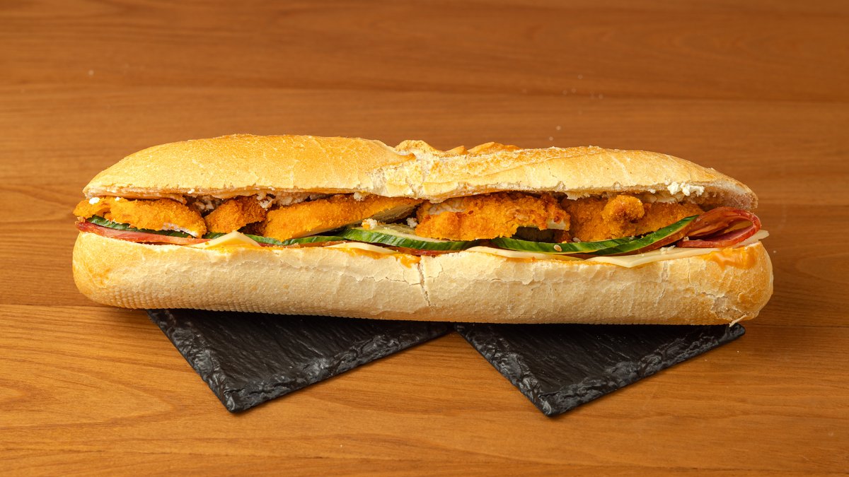 Μπαγκέτα λευκή με κοτομπουκιές, παρμεζάνα, μαρούλι, cheddar, ντομάτα, μέλι και μουστάρδα