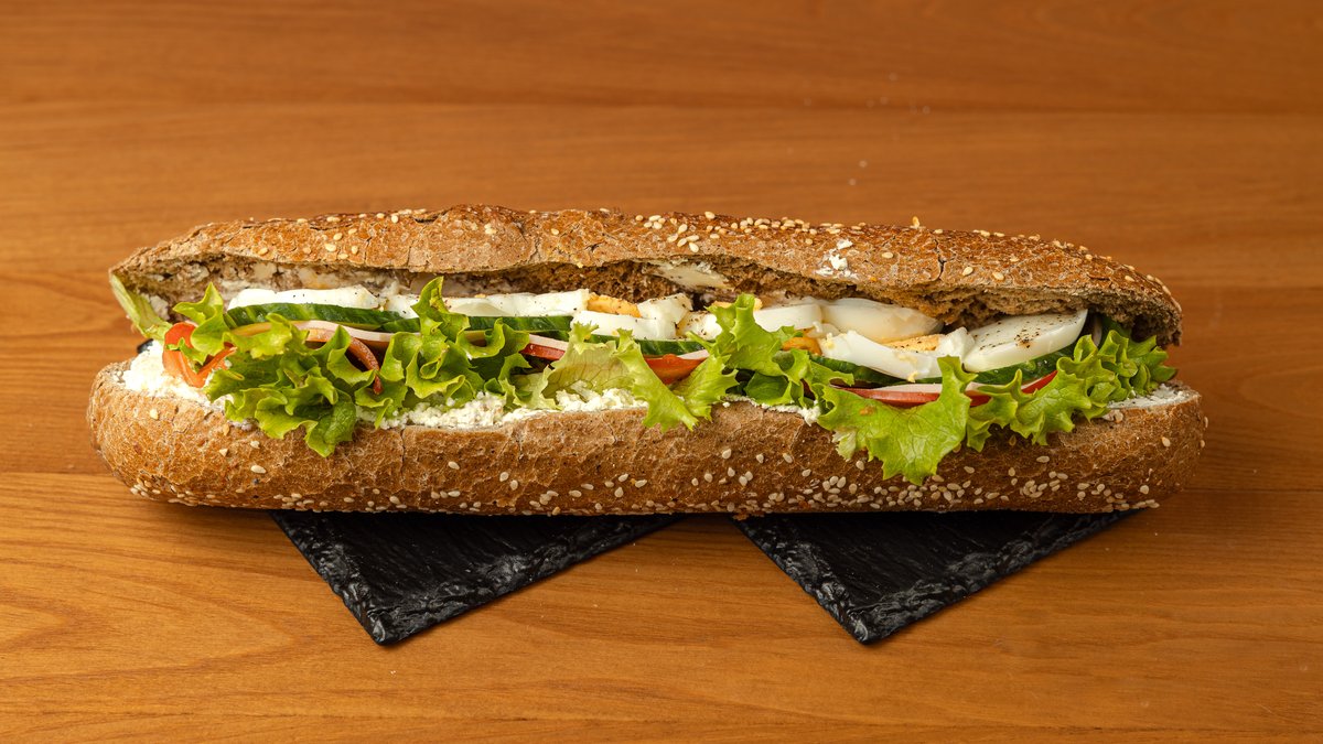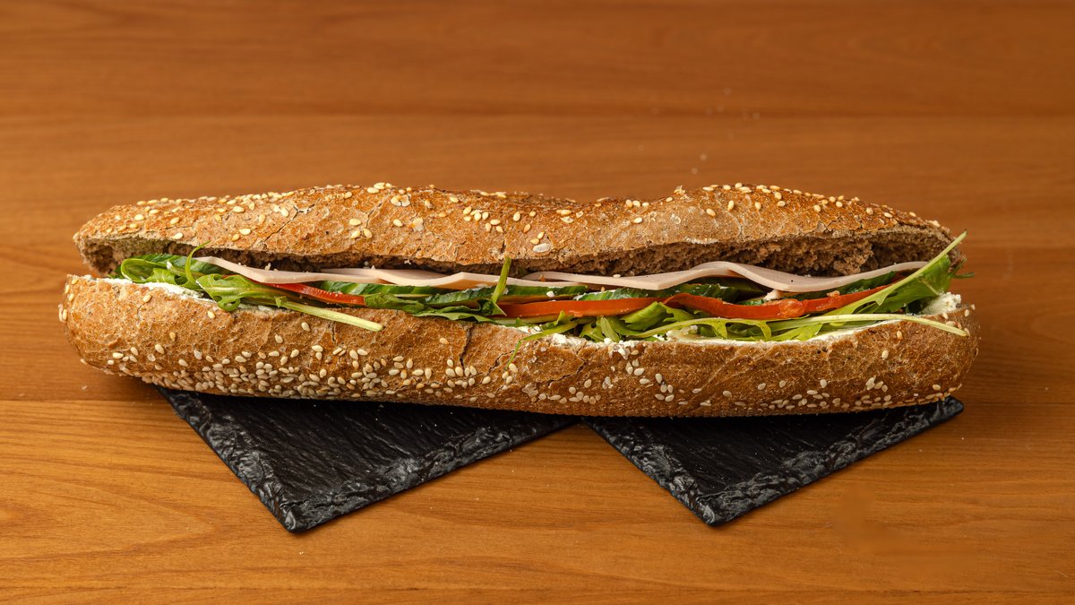 Μπαγκέτα ολικής με Philadelphia, γαλοπούλα, αυγό, αγγούρι, ντομάτα