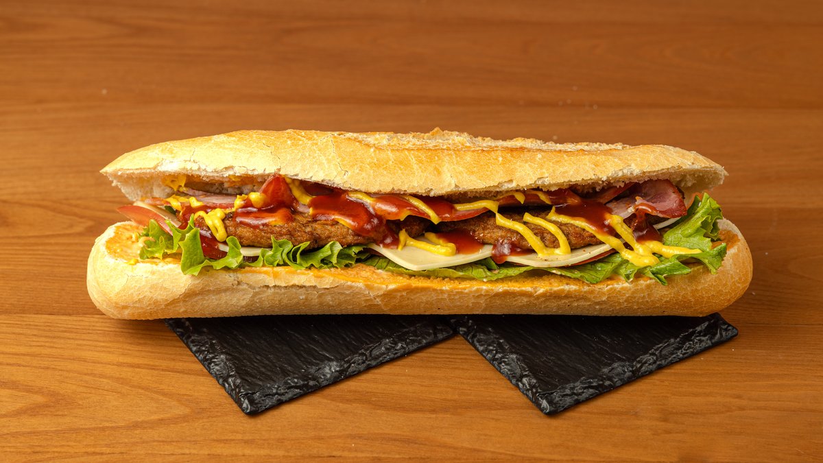 Μπαγκέτα λευκή με μπιφτέκι, τυρί cheddar, ντομάτα, μαρούλι, BBQ sauce