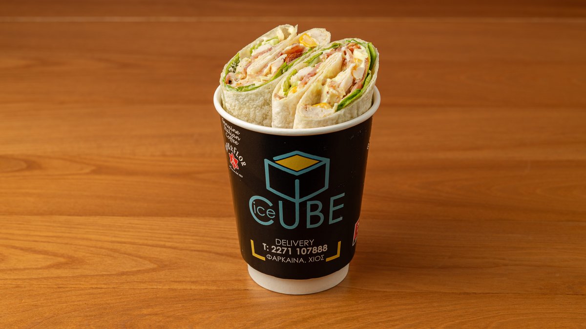 Τορτίγια με φιλέτο κοτόπουλο, bacon, μαρούλι, καλαμπόκι, παρμεζάνα, ντομάτα και σως Καίσαρα