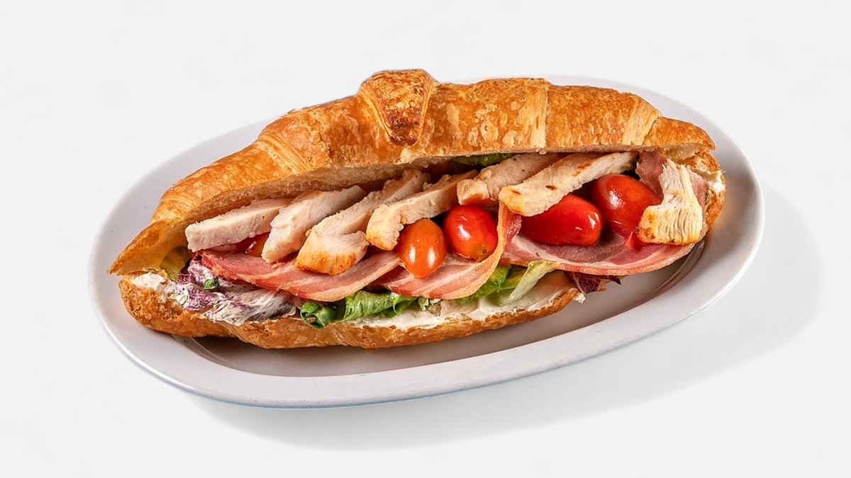 Κρουασάν με κοτόπουλο, παρμεζάνα, ντομάτα, μαρούλι, bacon, σως caesars