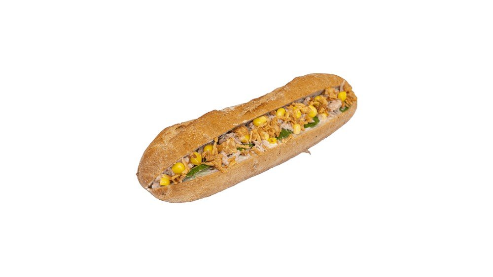 Μπαγκέτα Ολικής με τονοσαλάτα, καρότο, κρεμμύδι, μαγιονέζα, καλαμπόκι, ντομάτα μαρούλι