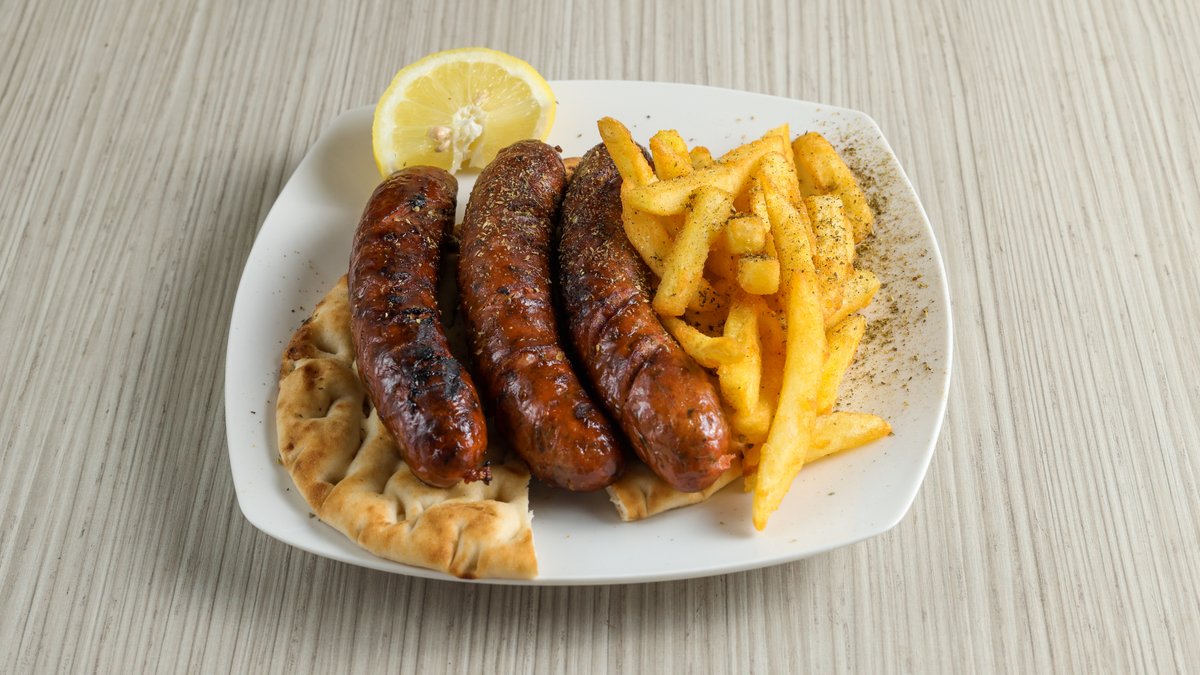 Μερίδα λουκάνικα χωριάτικα 3 Τεμάχια συνοδεύεται από πατάτες, πίτα, τζατζίκι ή sauce επιλογής