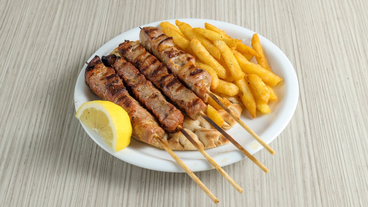 Μερίδα σουβλάκι χοιρινό 4 Τεμάχια συνοδεύεται από πατάτες, πίτα, τζατζίκι ή sauce επιλογής