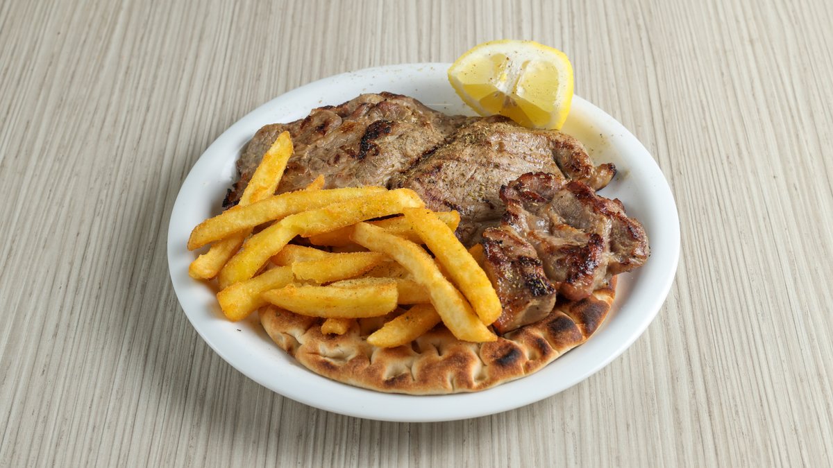 σουβλάκι χοιρινό, σουβλάκι κοτόπουλο, γύρος χοιρινός, γύρος κοτόπουλο, μπιφτέκια, λουκάνικο, μπέικον, κεμπάπ, sauce, πατάτες, πιτούλες και αναψυκτικό
