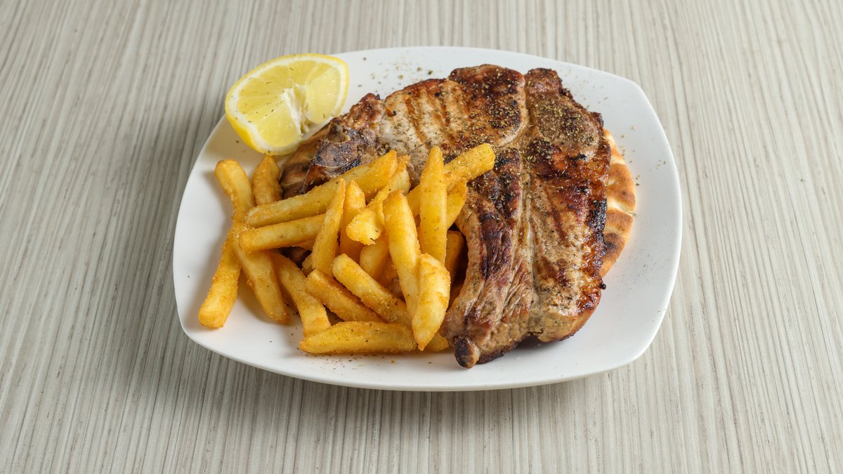 Μερίδα χοιρινή σπαλομπριζόλα συνοδεύεται από πατάτες, πίτα, τζατζίκι ή sauce επιλογής