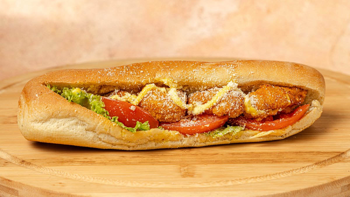 Σάντουιτς με κοτομπουκιές, παρμεζάνα, ντομάτα, μαρούλι και σως μουστάρδας